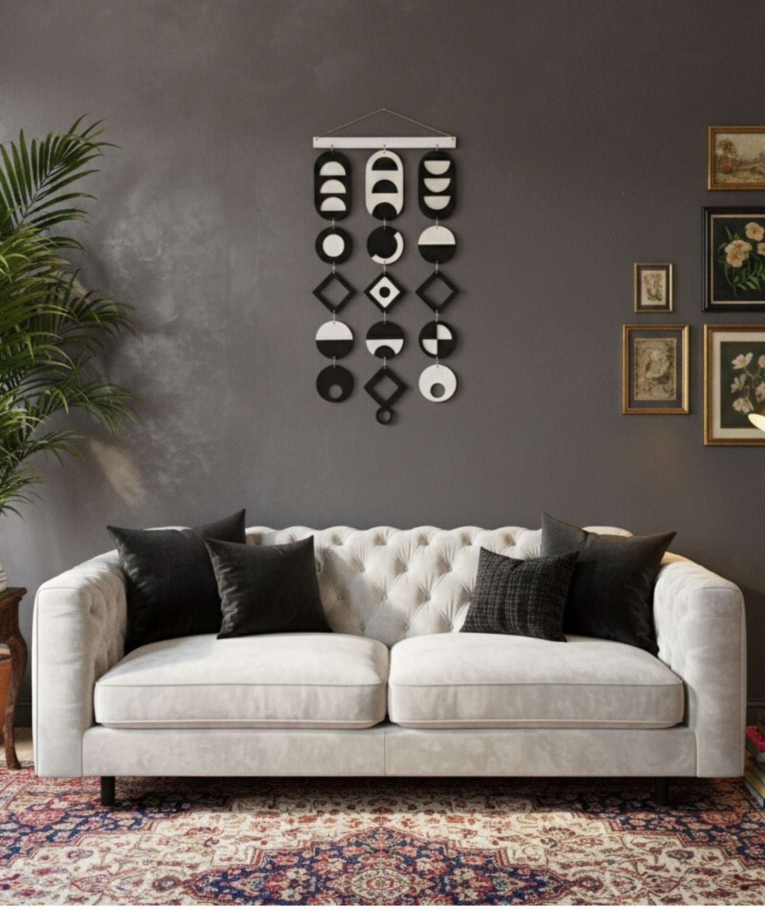 Siyah Beyaz geometrik duvar dekoru – el yapımı, doğal huş kontrplak
