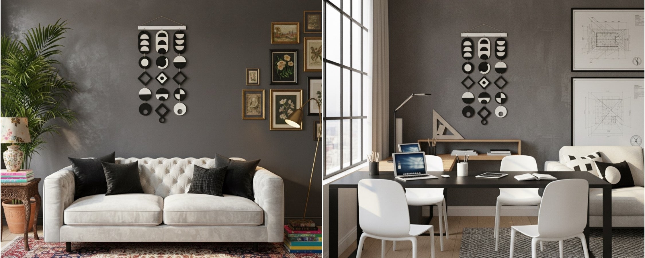 Siyah Beyaz geometrik duvar dekoru – el yapımı, doğal huş kontrplak